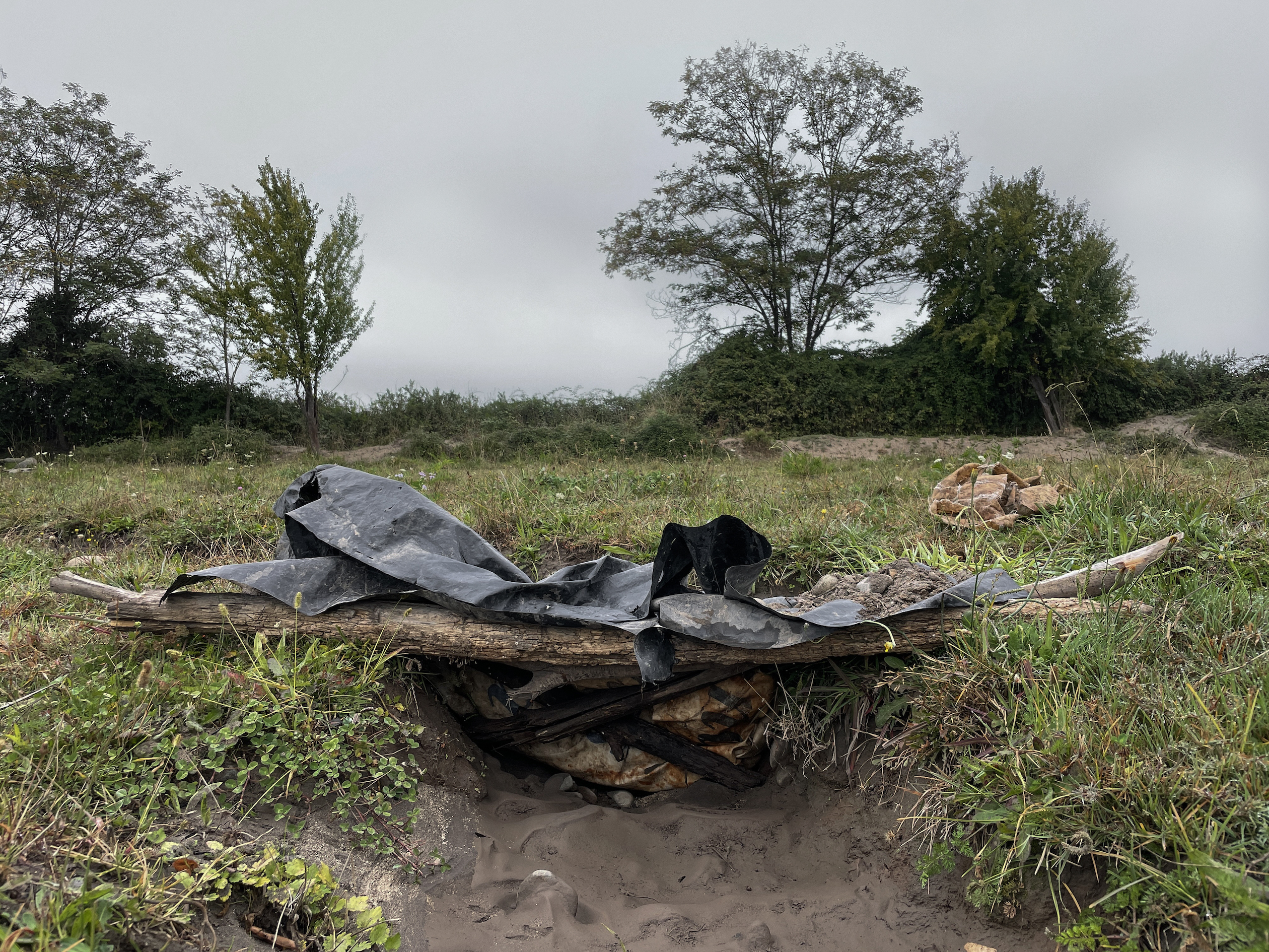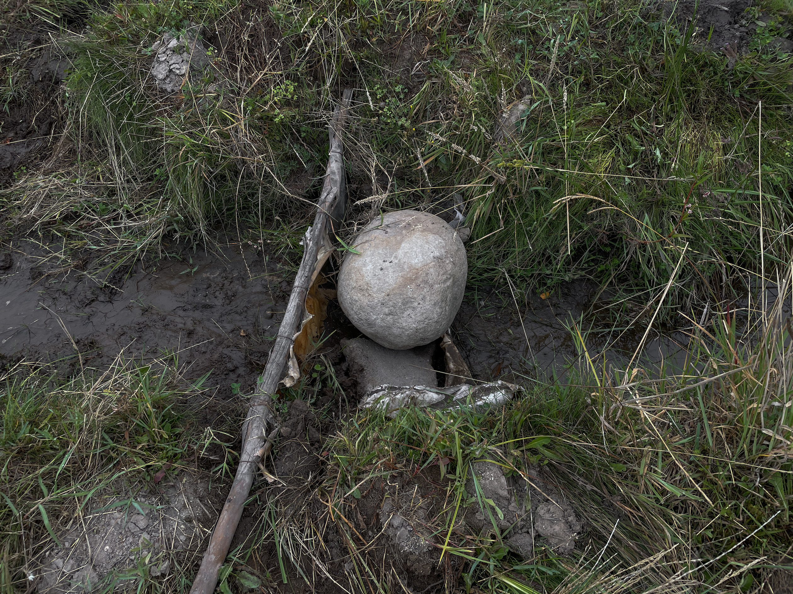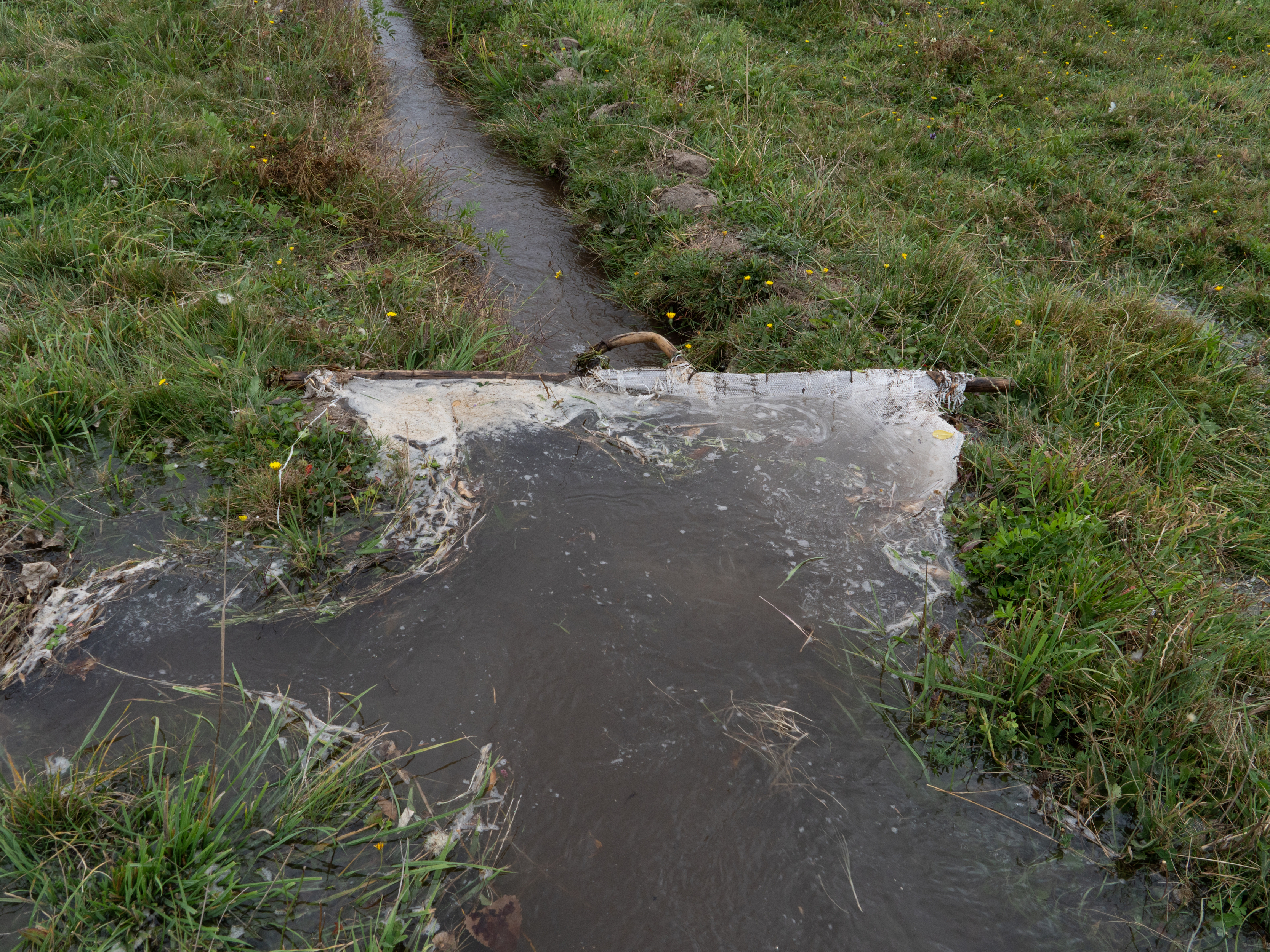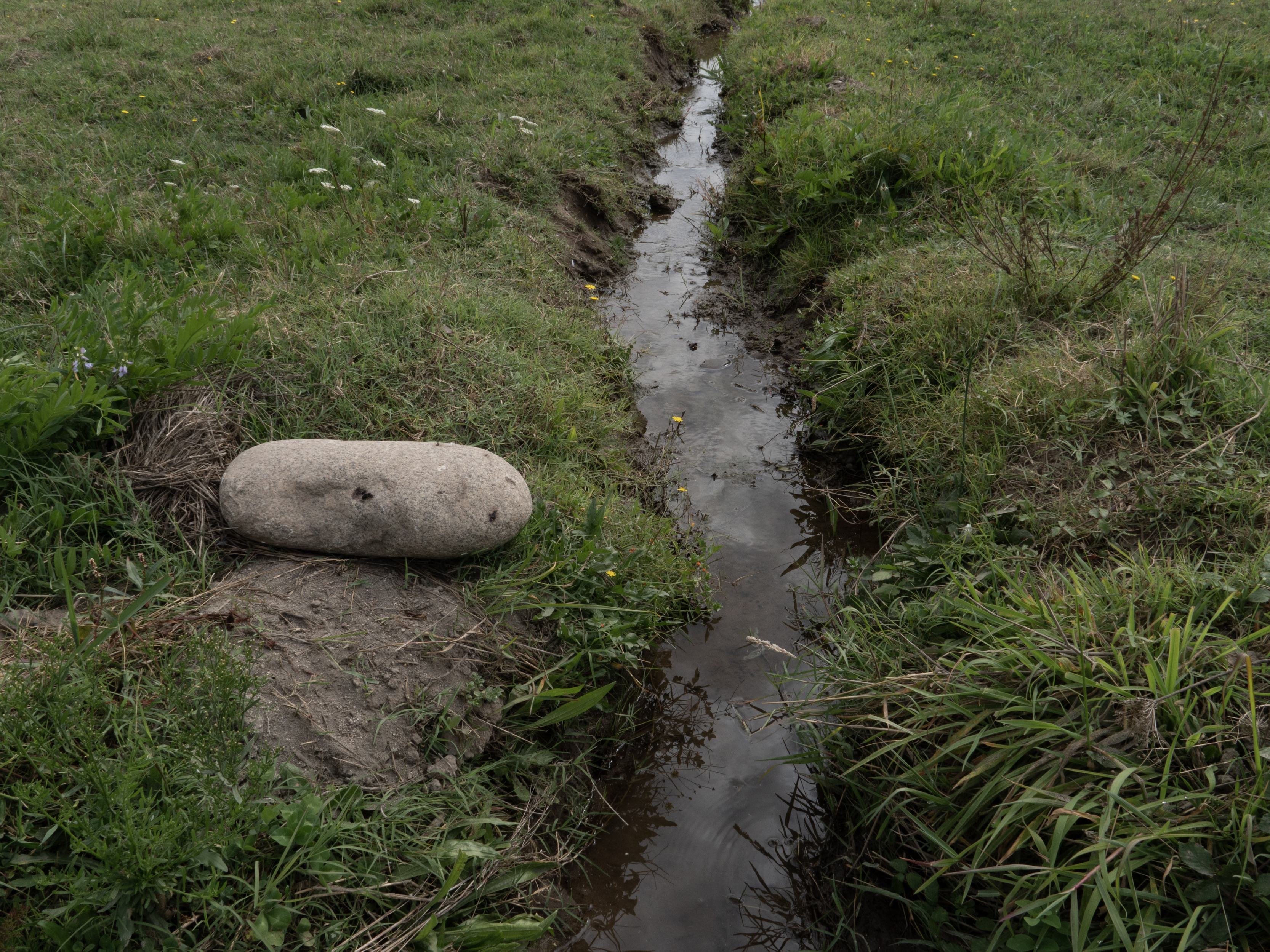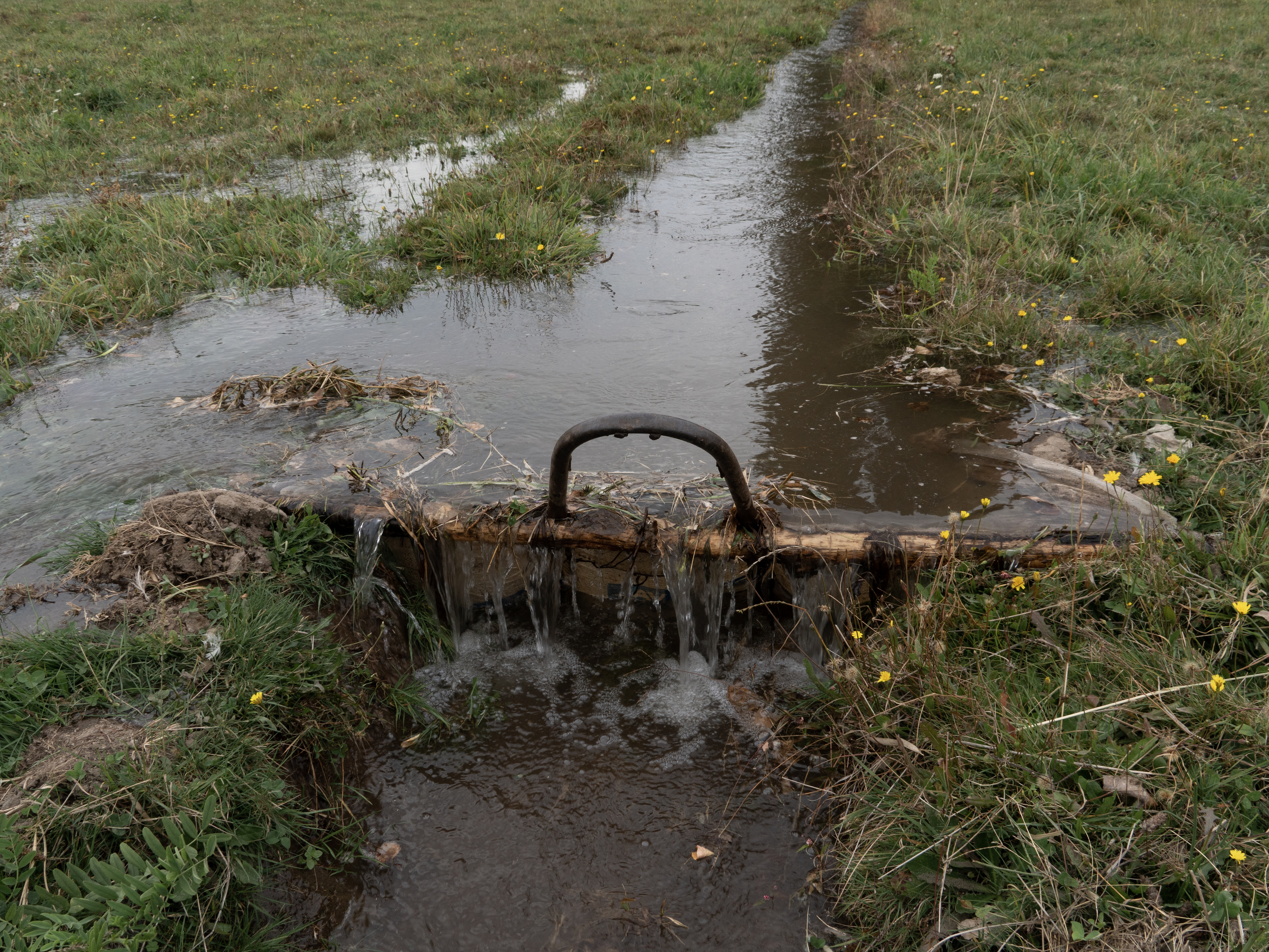En la serie Riego, Francisca Benítez aborda el papel que juega el riego en lo que ella llama un “sistema de soporte vital” en la región donde creció: la localidad rural de Pichingal en la zona central de Chile. “He estado investigando esta práctica, sus trazados, tipologías, maneras de hacer, tradiciones, personas dedicadas. Intentando trazar la historia del canal que riega el sector rural de donde provengo, Pichingal”, nos acota Francisca. Una forma de riego que es común en esta zona se conoce como riego botado. A través de este proceso, agricultores y regantes inundan sus tierras en pedazos, desviando el agua de los canales y guiándola a través de pequeñas represas efímeras, conocidas localmente como “tacos”, usando la pendiente del terreno y la dirección de la corriente.